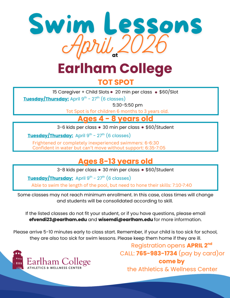 There are many times you’ll find we are offering swim lessons for children ages 4-13! Must be potty trained and no previous experience is needed. Register at the AWC Welcome Desk or at 765-983-1734