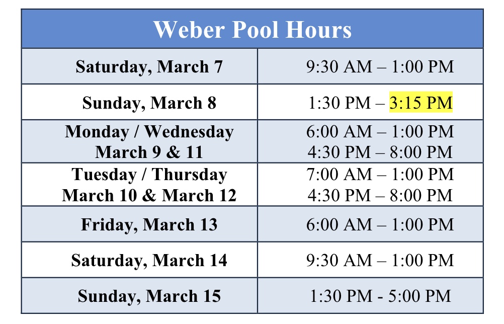 Weber pool hosts a wide variety of programming and events throughout the year. The pool features six-lanes at 25 meters. The shallow end starts at three and a half feet and runs to eleven feet at its deepest. Students, faculty, staff and community may take advantage of our numerous aquatic programs including water fitness, swim lessons, physical education courses, recreational sport events, American Red Cross Lifeguarding courses, rental events, lap, and open swimming.
